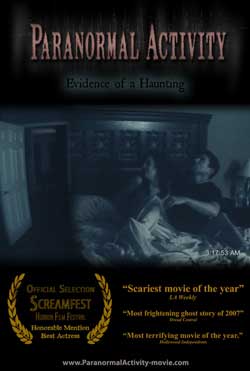 That's right, Paranormal Activity is spreading through the nation's megaplexes faster than MRSA through a M*A*S*H unit. Filmed in a house with a bed, and made on a shoestring budget of $15,000…or possibly a 2007 Kia Sportage budget, audiences come away shaken, stunned, and soaked in their own urine.